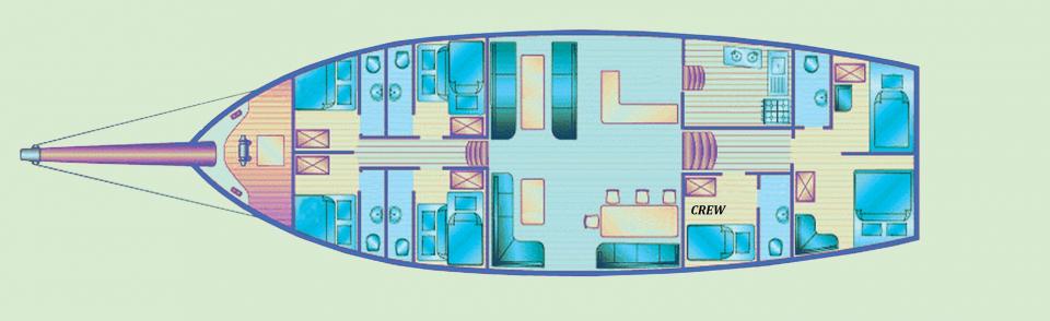 L’esterno è caratterizzato da 2 grandi aree: a poppa è presente un divano relax, vicino al tavolo da pranzo per tutti gli ospiti e la zona verso prua è presente la zona solarium con comodi materassi prendisole. Sottocoperta un grande salone, dotato di tavolo, comodi divani, banco bar e l’accesso ai due corridoi sui quali si aprono le camere da letto, molto più spaziose che su una barca a vela. Verso poppa abbiamo la cabina Master la più spaziosa, realizzata tutta in mogano e larice sbiancato e con due grandi finestre sul mare. Verso prua troviamo le altre quattro cabine doppie, comode e spaziose tutte con oblò. I servizi sono privati per ogni cabina. Gli alloggi dell’equipaggio sono separati. Vogliamo farvi avere, con una navigazione sempre sicura, la visione delle più belle coste del Mare Nostrum.